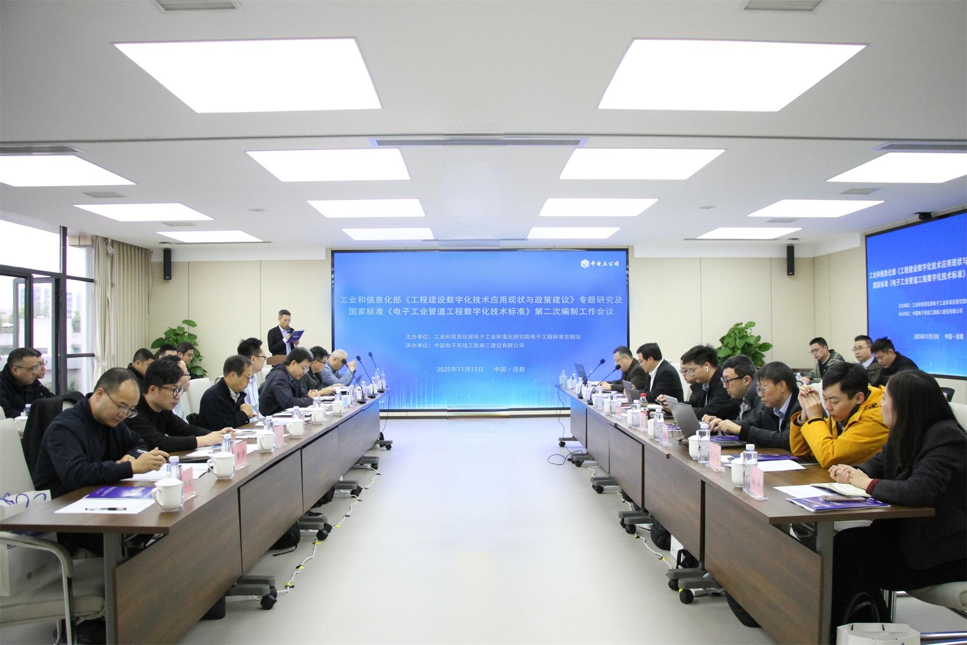 2025年11月13日,工业和信息化部《工程建设数字化技术应用现状与政策建议》课题研究及国家标准《电子工业管道工程数字化技术标准》编制会议在中电三公司成功召开。工业和信息化部电子工程标准定额站副主任景晓晖及高级工程师杜宝强、中电三公司党委副书记、总经理杨登伟等领导及相关单位的32位权威行业专家出席本次会议。会议由中电三公司副总工程师、工程技术管理中心总经理霍金鹏主持,中电三公司作为本次会议的承办单位深度参与了课题研讨与标准编制工作。